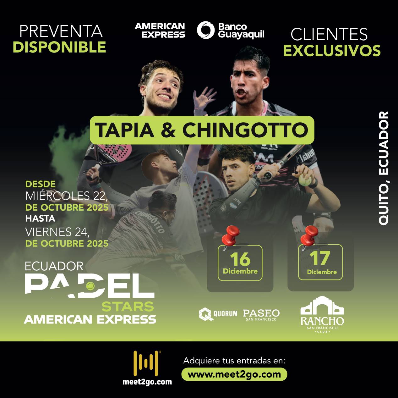 Preventa disponible 🎟️ del 22 al 24 de octubre para clientes American Express Banco Guayaquil y Socios del Club Rancho San Francisco.
